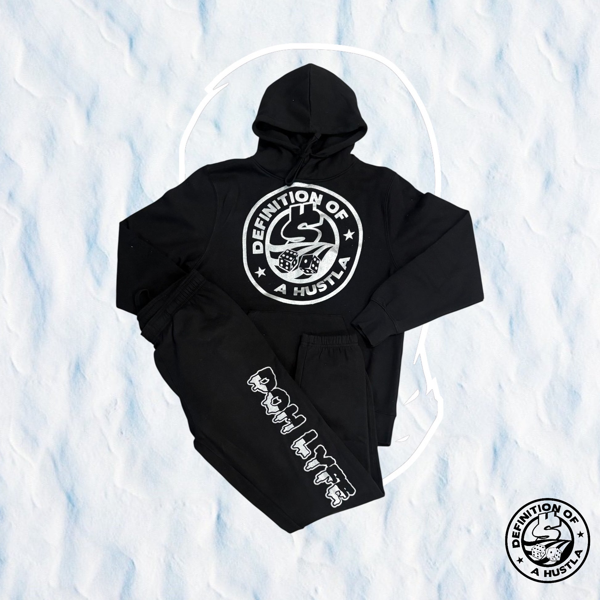 Dohlyfe Definition Of A Hustla Stamp Black/Silver Black jogging suit with dohlyfe down leg…